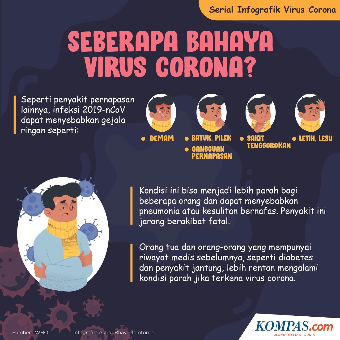 Infeksi virus Corona atau COVID-19 bisa menyebabkan penderitanya mengalami gejala flu, seperti demam, pilek, batuk, sakit tenggorokan, dan sakit kepala; atau gejala penyakit infeksi pernapasan berat, seperti demam tinggi, batuk berdahak bahkan berdarah, sesak napas, dan nyeri dada.